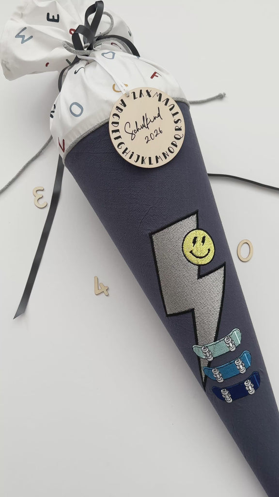 aus blauem Baumwollstoff unf einem gestickten Stoff Blitz, Smiley und Skateboards und wahlweise dem Namen deines Kindes.