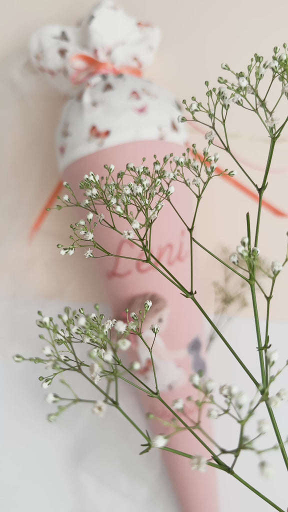 Schultüte aus rosa Baumwollstoff und weißen Musselin und Schmetterningen